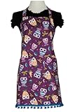 Two sisters, together with their mother, own and operate Sassy Cook'n located just outside of Boise, Idaho. This small family run business prides itself on selling high quality textile products manufactured in the USA for a great value. The fresh line of coordinating kitchen wear is constructed with 100-Percent premium cotton fabric and all of the aprons are adorned at the bottom with faux suede fringe or pom-pom trim. Who's Looking When You're Cooking. You're Serving In Style. This whimsical print is fun and fashionable featuring owls in pink, lilac, and goldenrod with leaves in green and teal on a purple background. The bottom of the apron is trimmed in teal pom-pom fringe. This novelty apron is fully adjustable with D-rings on the neck strap and extra long back ties making it one size fits all. Machine wash and dry. Machine wash and dry.- Women's bib style apron featuring whimsical owls and leaves on purple cotton fabric; bottom trimmed with teal pom-pom fringe