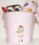 Calling all little bakers! Retro aprons are a must have for all mommy helpers! This little girl apron features a retro pattern of paper dolls and comes with two rick-rack trimmed pockets just perfect for holding a small rolling pin or cookie cutter! This gift set comes with the apron, retro rolling pin and a mini muffin tin bundled in a 5 1/2 inch high enamelware bucket with coordinating decal! Use the bucket to hold baking supplies or just display on a shelf.- Perfect for the little baker in your life!