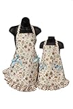 Matching Mother and Daughter Kitchen and hostess aprons for celebrating thegood times in party print of gold accented cakes and streamers with a co-ordinating ruffle and pocket flap of gold accented cupcakes print. Delicate blue piping edgesthe skirt and each pocket which is finished with a light blue removable bow.