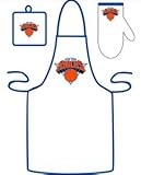 Our fan-friendly sports apron set is what every backyard chef will want to use at their next tailgating even. This barbecue apron will keep you clean no matter how messy it gets. These white aprons feature your favorite team's name and logo. Also has matching trim and straps. The set also includes a matching mit and potholder. The apron is 100% cotton, 34" long and 29.5" wide.- Officially licensed by the NBA