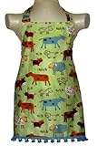 Two sisters, together with their mother, own and operate Sassy Cookân located just outside of Boise, Idaho. This small family run business prides itself on selling high quality textile products manufactured in the USA for a great value. The fresh line of coordinating kitchen wear is constructed with 100% premium cotton fabric and all of the aprons are adorned at the bottom with faux suede fringe or pom-pom trim. Itâs Family Night â" Round âEm In and Dish It Up! This fun country print will appeal to animal loverâs everywhere and features farm animals with adorable expressions on a sage green background. The bottom of the apron is trimmed in light blue pom-pom fringe. This "Barnyard Buffet" novelty junior apron fits most ages 7 â" 10 and is fully adjustable with D-rings on the neck strap and extra long back ties. Machine wash and dry.- Child's bib style apron featuring barnyard animals on sage green background; bottom trimmed in light blue pom pom fringe